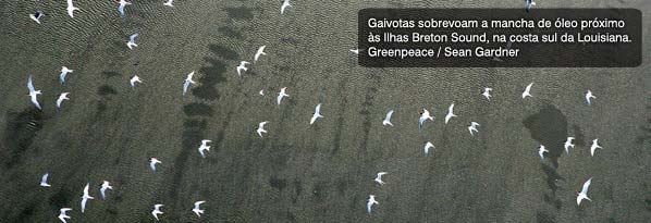 “As aves marinhas possuem um óleo natural que cobre o corpo e as possibilita de mergulhar no mar sem afundar”, explica Leandra Golçalves, Coordenadora da Campanha de Oceanos do Greenpeace. Com o tingimento das penas de negro petróleo, as aves perdem esta cobertura natural e ficam impossibilitadas de mergulharem. “Isto sem falar nos níveis de toxicidade a qual os peixes e as baleias estão expostos. A cada vez que uma baleia vai à superfície para respirar, está levando petróleo aos pulmões”, acrescenta Leandra.