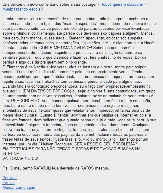 Por fim, depois de muita lenga lenga, tentativas de se fazer passar por uma pessoa normal, tentar enganar os leitores do AQIP para que imaginassem que você seria diferente, educado, passível até mesmo de uma conversa mais racional, onde alguns podem até ter pensado que você fosse inteligente, ou até mesmo gente, você deixa cair a máscara e deixa a sua bazófia falar mais alto e termina sua conversa com a tipicidade flamenguista.