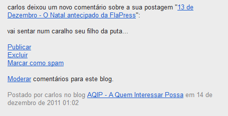 Muitos iludidos de cores vermelho e pretas, se sentiram ofendidos em terem sido enganados pela FlaPress e resolveram descontar suas raivas aqui no AQIP. Prometo a todos que se um dia eu puder estar de frente com algum poderoso da Globo ou Cia, repasso todas as palavras que foram escritas por nossos visitantes passageiros.