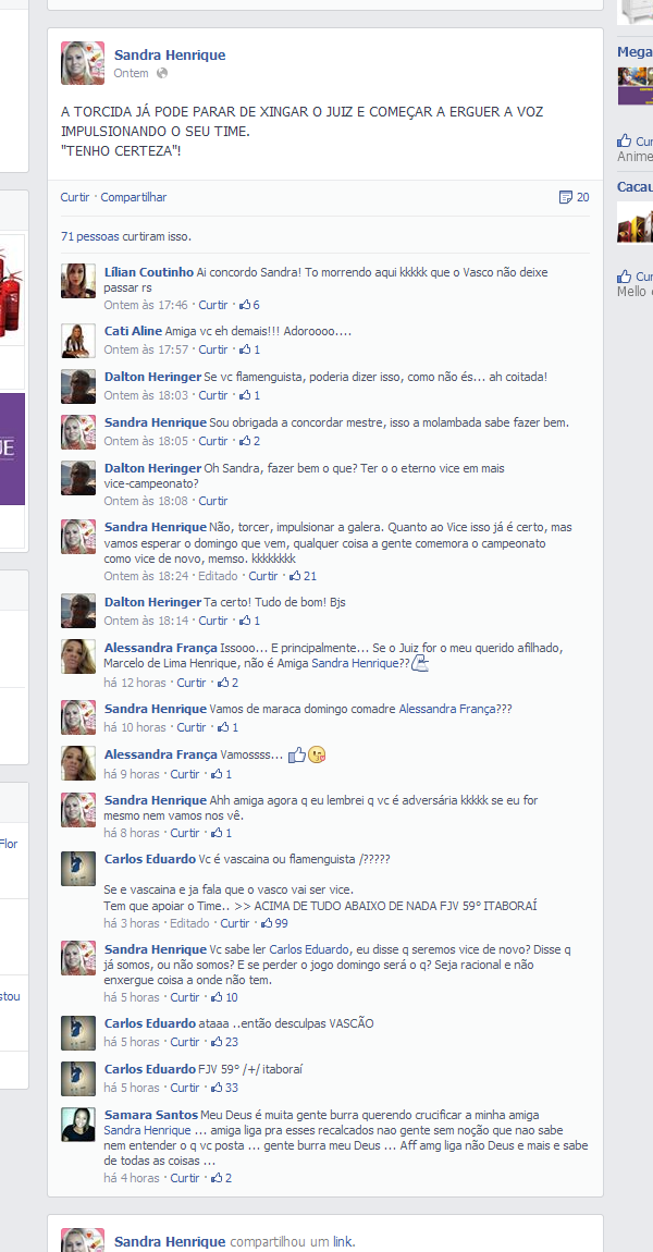 Como isso aconteceu? Pelo Facebook, Sandra Henrique, suposta vascaína, (Veja o perfil dela aqui) fez declarações para lá de intrigantes, escandalosas, comprometedoras e esclarecedoras. Entre discussões e comentários, a mulher de Marcelo de Lima Henrique chama para a Final do Carioca, os holofotes para seu marido. Isso é bom para o marido? Não. É bom para o Vasco? É. Como veremos mais adiante.