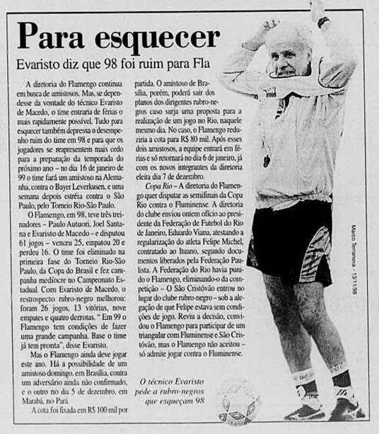 Era o que a Flapress precisava já que o ano do Flamengo tinha sido terrível. Evaristo de Macedo, técnico do time na época , pede para a torcida esquecer 98.