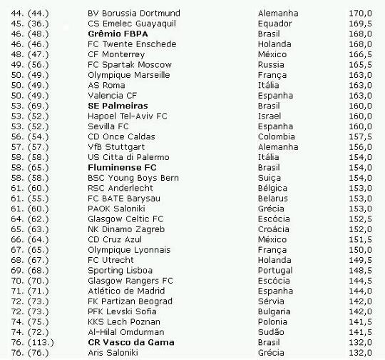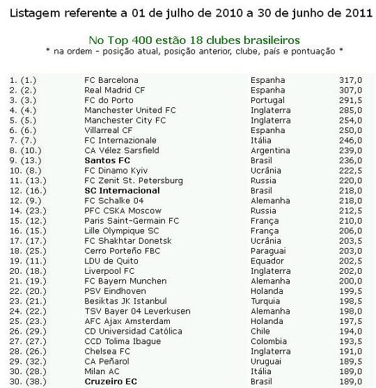 Vejam a listagem referente a 01 de julho de 2010 a 30 de junho de 2011 que é a mais recente. Mostramos os 30 primeiros e depois somente os blocos onde se encontram um time brasileiro. E como um recado para o José que acompanha a coluna “Existo. Logo penso”, o time mais protegido e ajudado no Brasil está apenas em 197º lugar, atrás de times como Atlético-PR, Goiás e Avaí e todos os seus rivais do Rio de Janeiro. Os times cariocas estão em 58º, (Fluminense) 76º (Vasco da Gama) e 163º, (Botafogo) ficando o time da beira da Lagoa a no mínimo 34 posições abaixo de outro time carioca. Mas ninguém vai mostrar isso nas Organizações FlaPress Globo, vai?